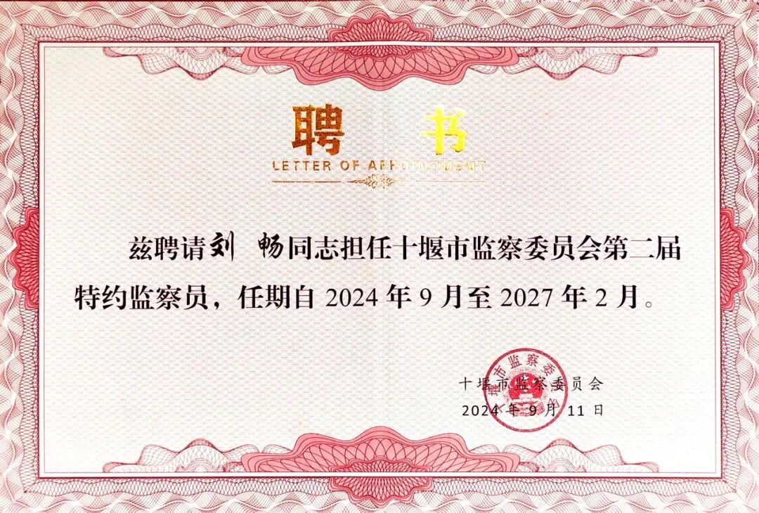 2024年9月11日,十堰市监察委员会召开第二届特约监察员聘请会议,聘请15名特约监察员,市委常委、市纪委书记、市监委主任聂汉平出席会议并向特约监察员颁发聘书,刘畅律师参加会议并受聘为十堰市监察委员会第二届特约监察员。