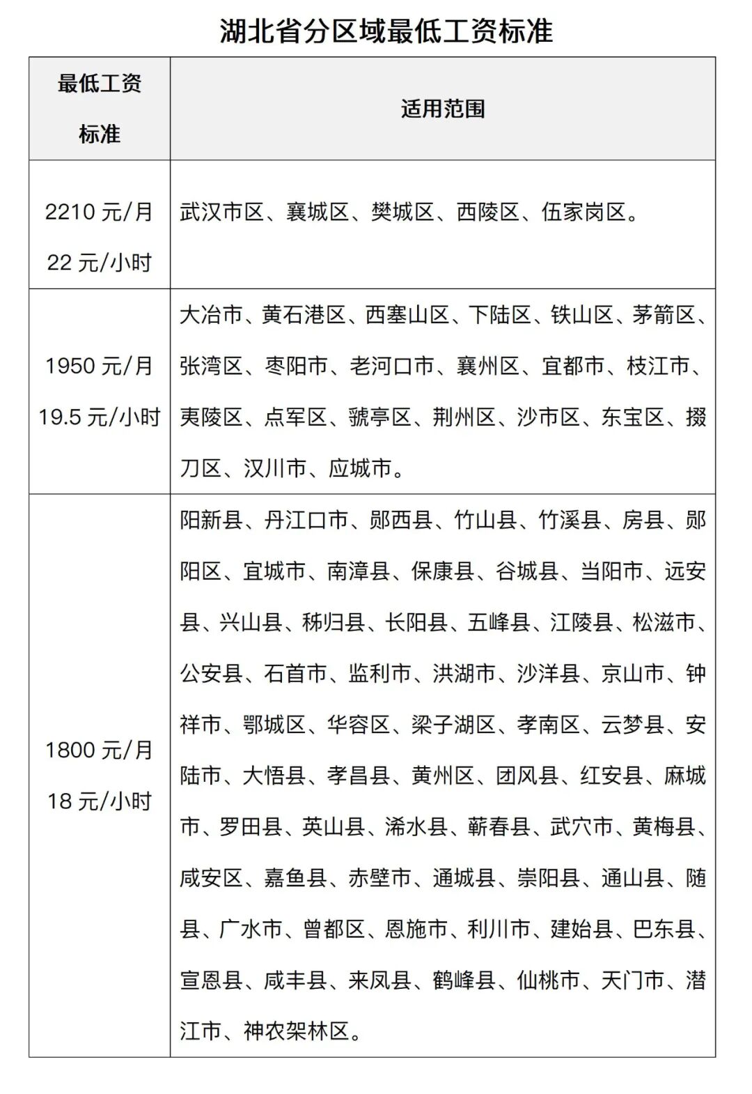 2024湖北省分区域最低工资标准如下: